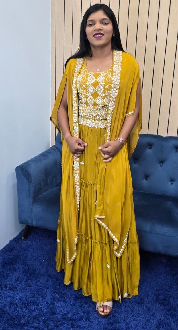Grey Yellow Contrast Indo western In Pure Soft Crepe with Heavy Mirror Work Top, Drape Style Skirt And Cape.