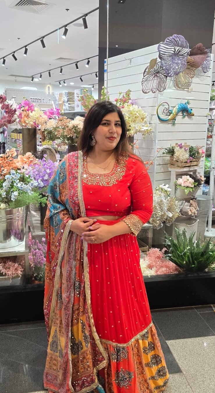 Rust Orange Lehenga with Mirror work on Blouse Paired with Multi Chinnon Dupatta