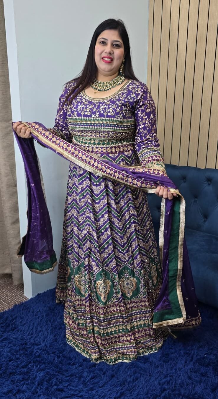 Purple & Green Crepe Silk Lehenga with Heavy Mirror Work and Chinnon Dupatta with Potli