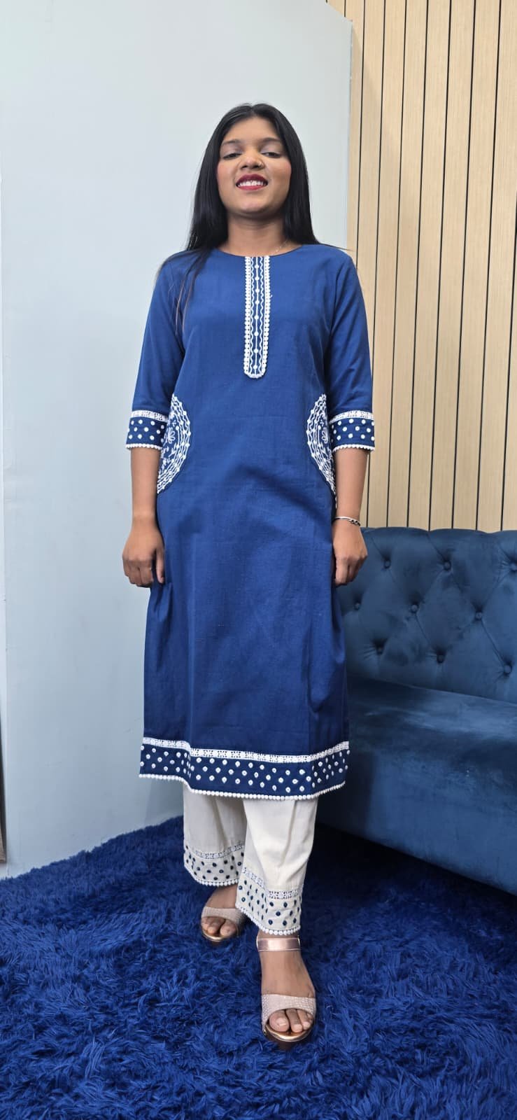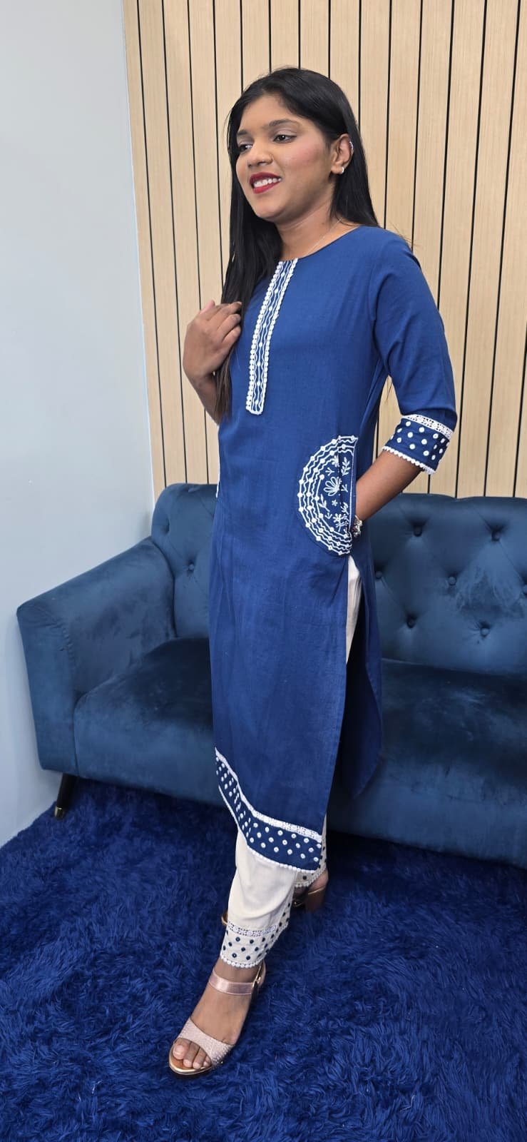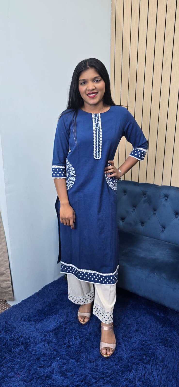 Beautiful Blue kurta set featuring subtle handwork on neckline, sleeves & pocket Comfortable, stylish, and perfect for daily wear or casual outings.