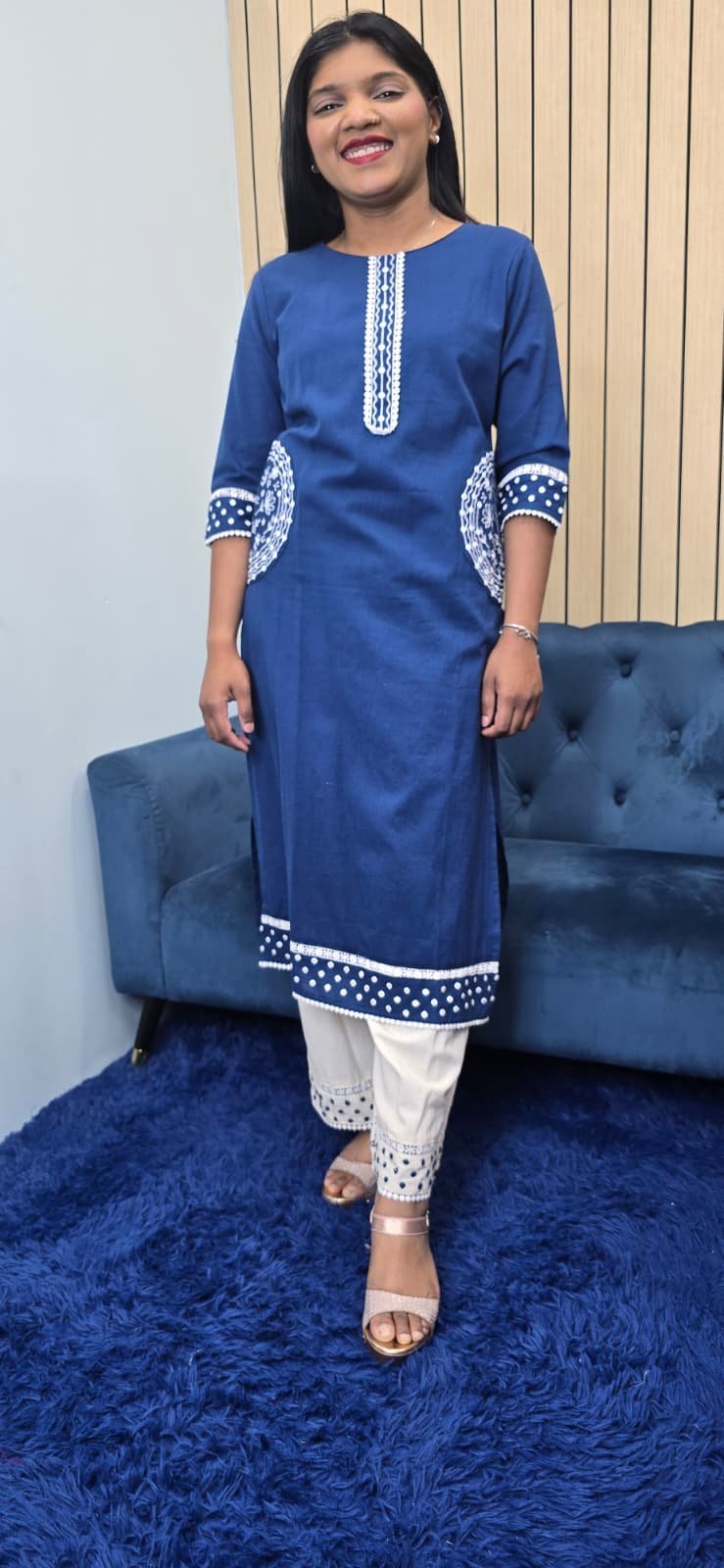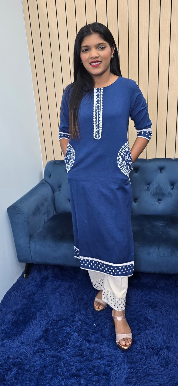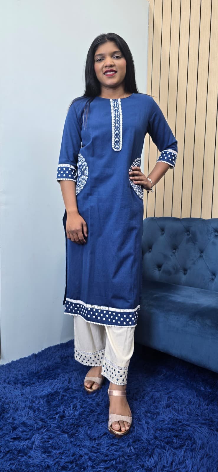Beautiful Blue kurta set featuring subtle handwork on neckline, sleeves & pocket Comfortable, stylish, and perfect for daily wear or casual outings.