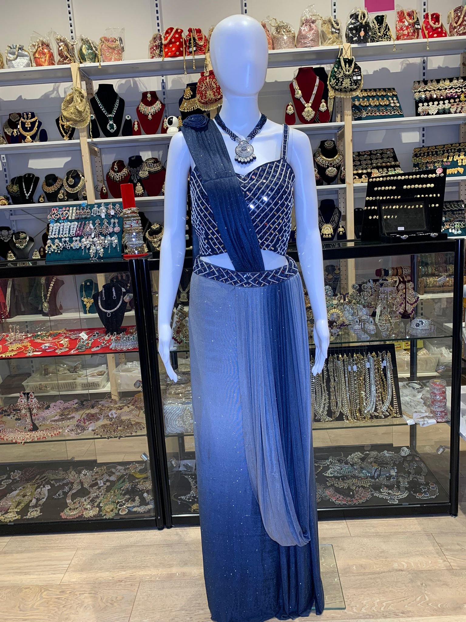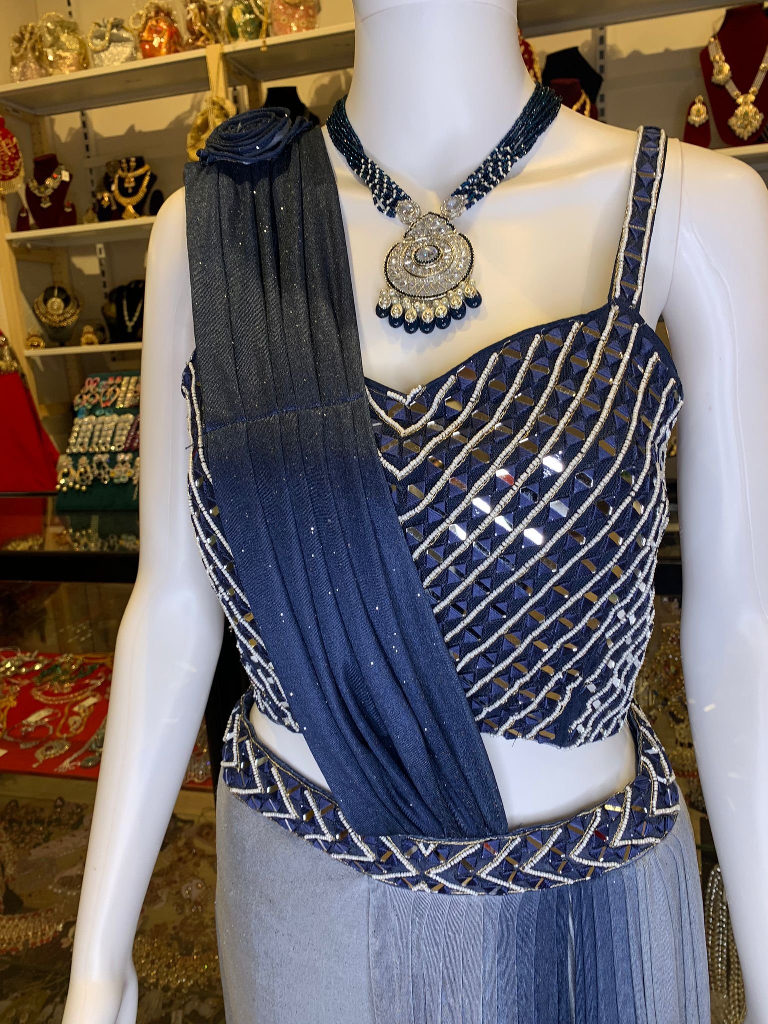 Blue Indowestern Saree Drape design Skirt With Heavy Mirror Work Blouse.