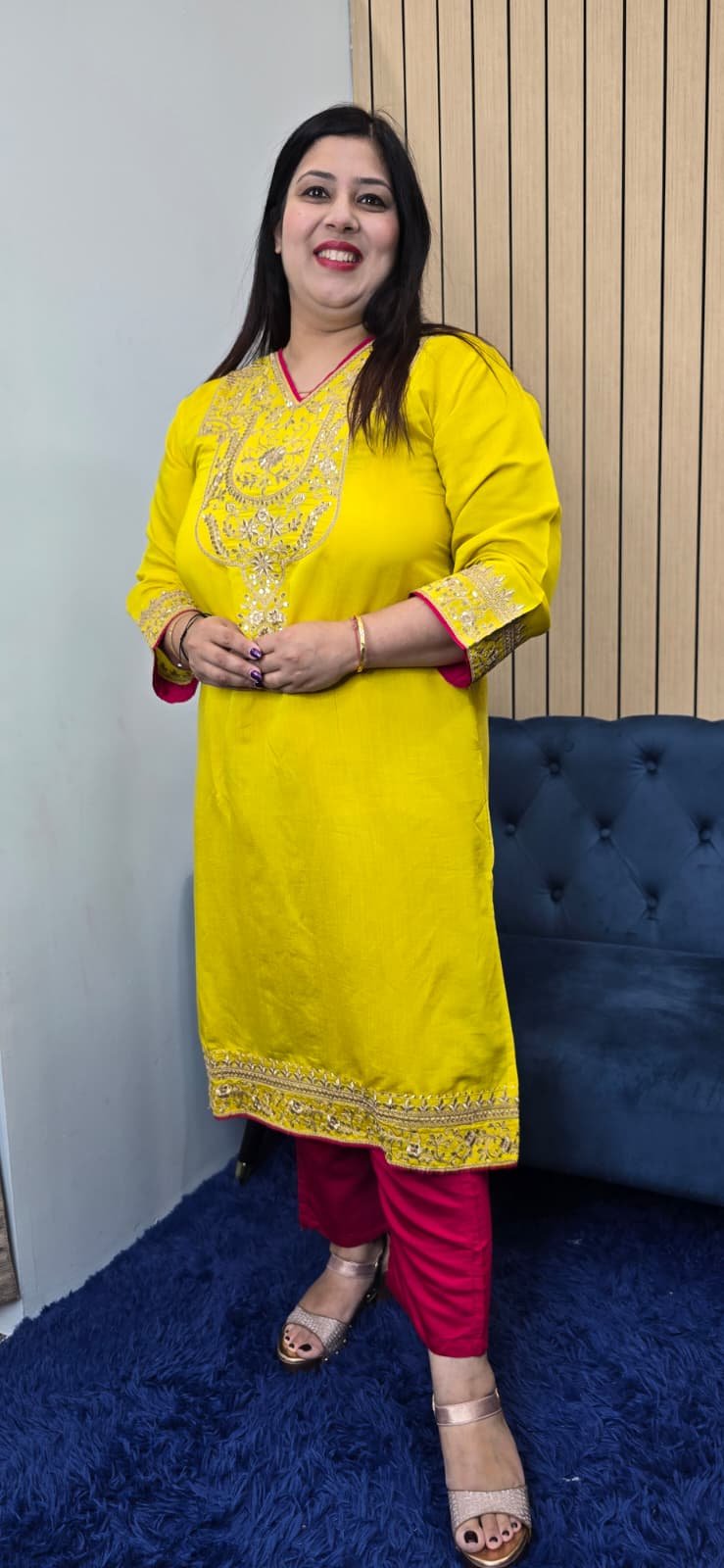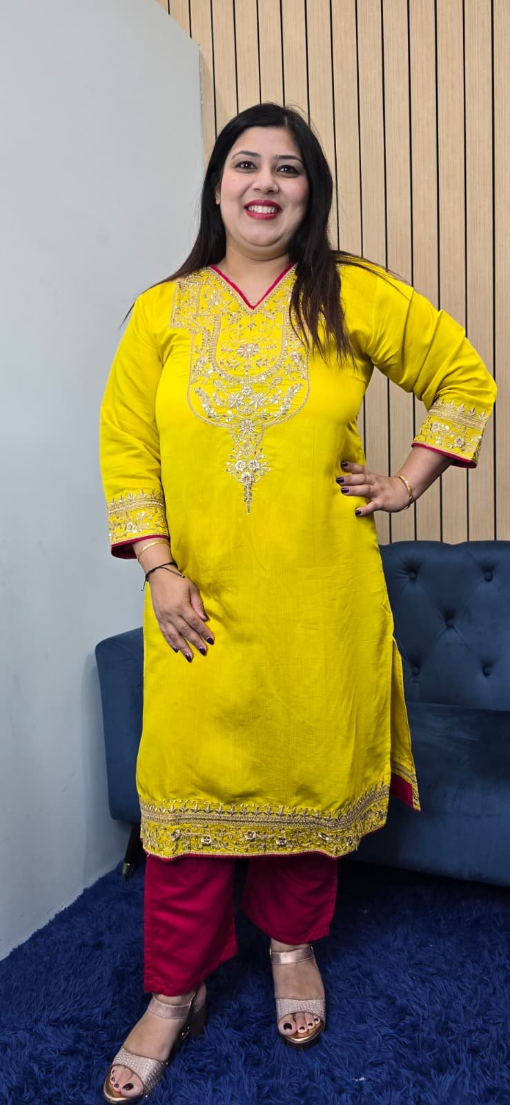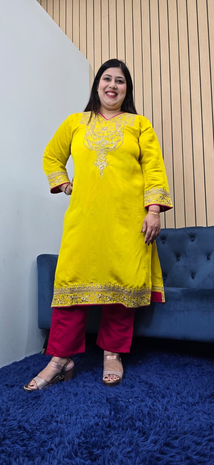 Yellow Pink Combination Cord Set/Kurta Set with Zari Work with complimentary Potli