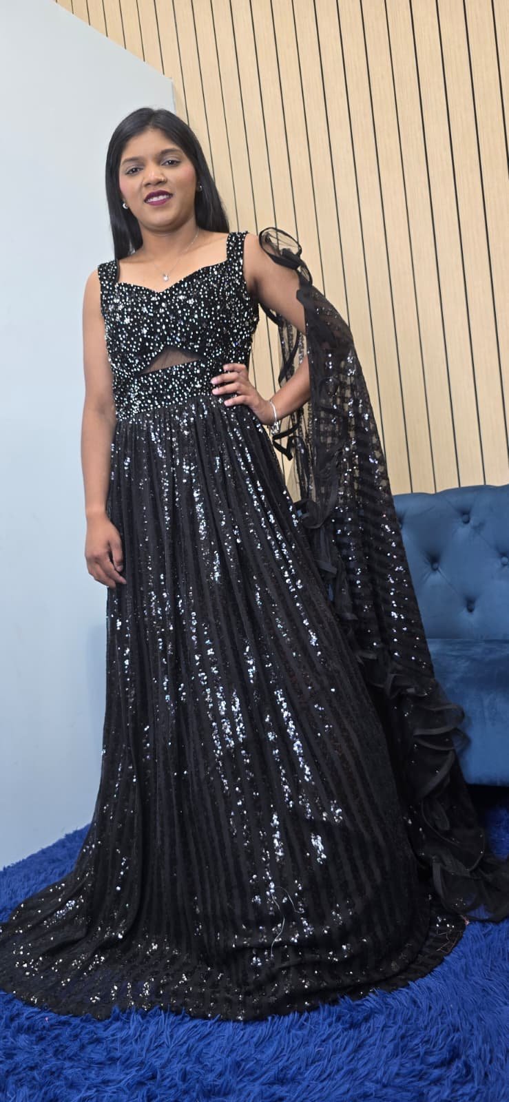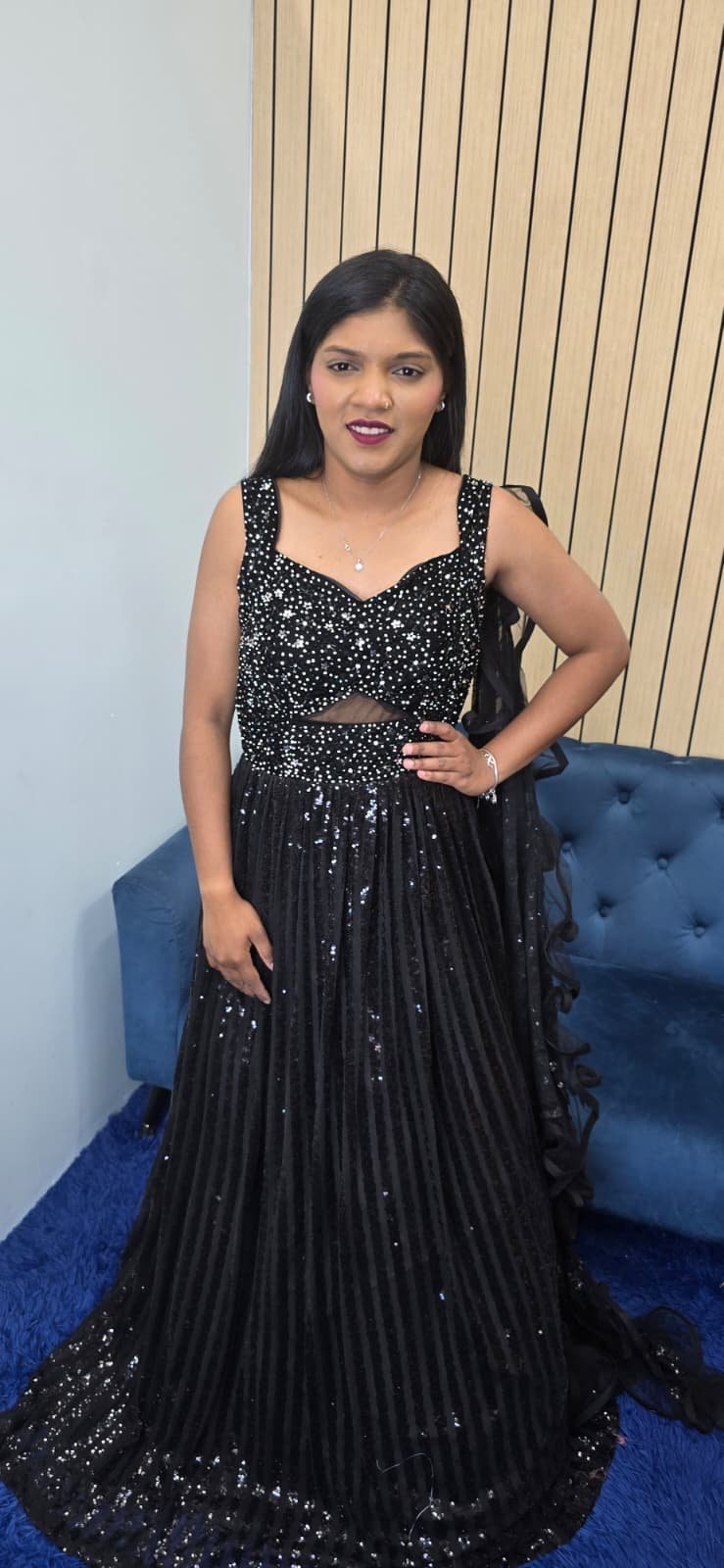 This elegant black evening gown features shimmering sequin details and a flattering fitted design. The floor-length gown flows beautifully, A sheer, ruffled drape detail over the arm elevates the design with a touch of sophistication, making it perfect for formal evenings, galas, weddings, and special occasions.
