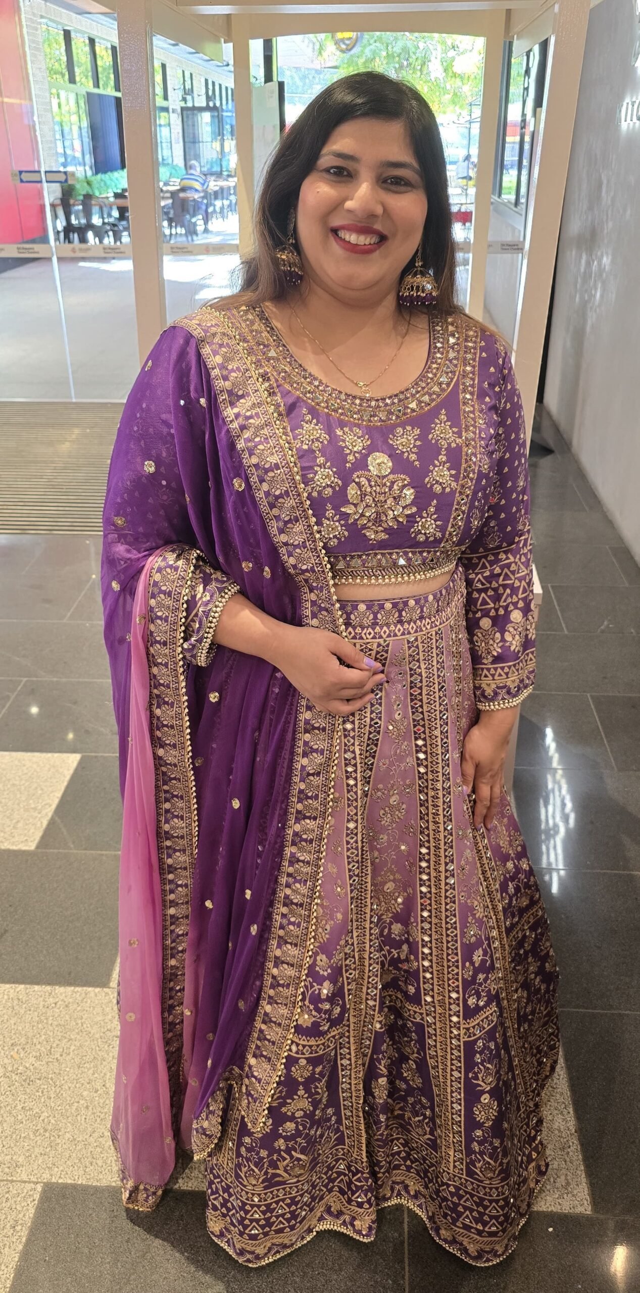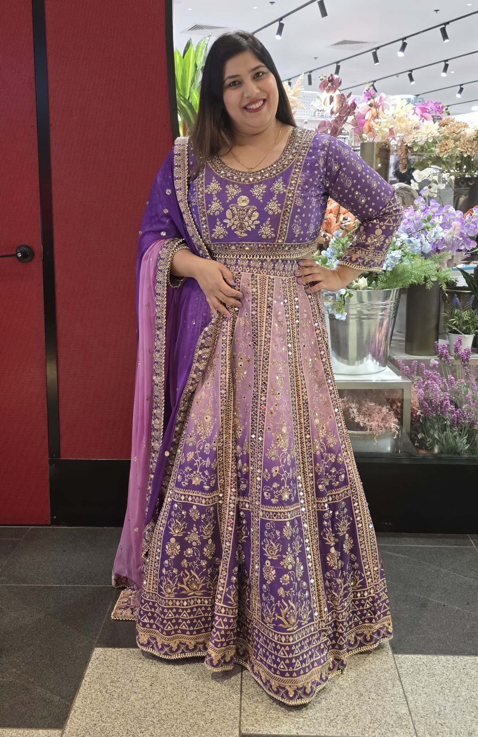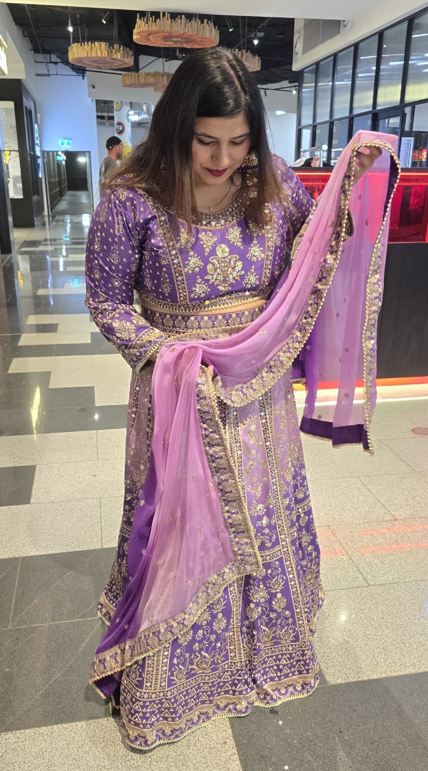 This elegant purple lehenga features heavy mirror work that highlights its traditional charm and refined craftsmanship. The fitted blouse is beautifully detailed, while the flared skirt flows gracefully with intricate patterns throughout. Paired with a matching dupatta, this lehenga is perfect for weddings, festive celebrations, and special occasions, offering a timeless blend of tradition and elegance.