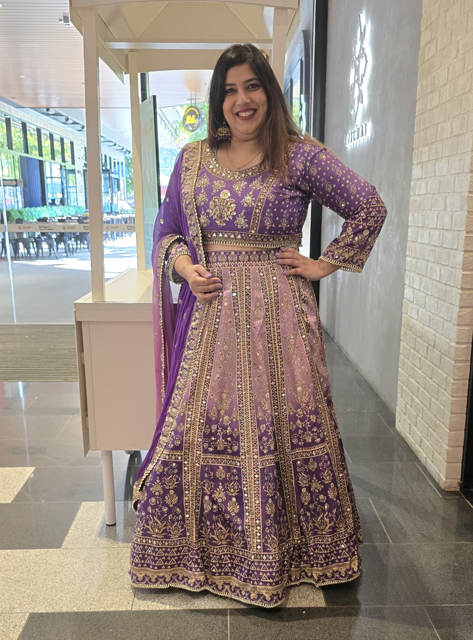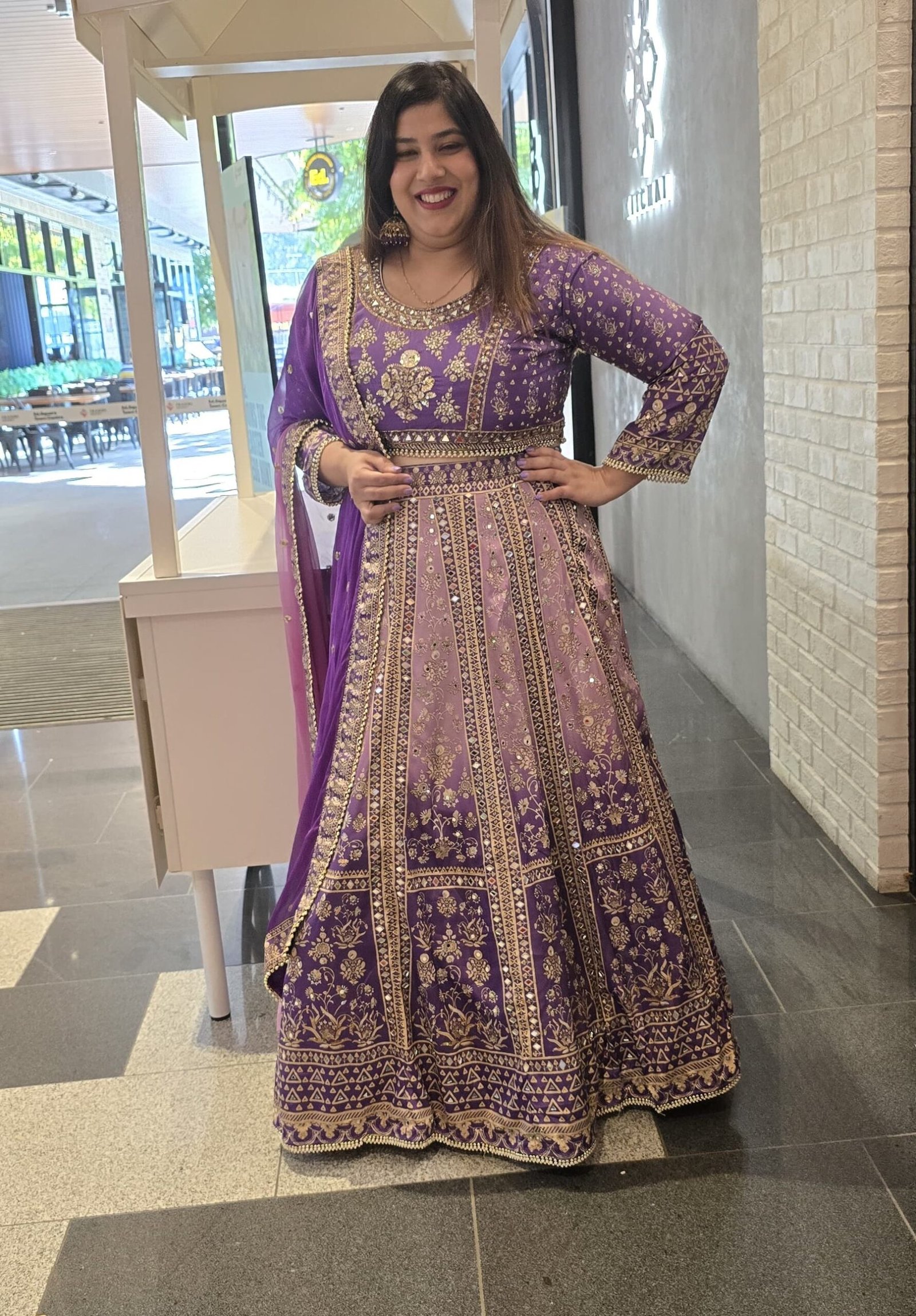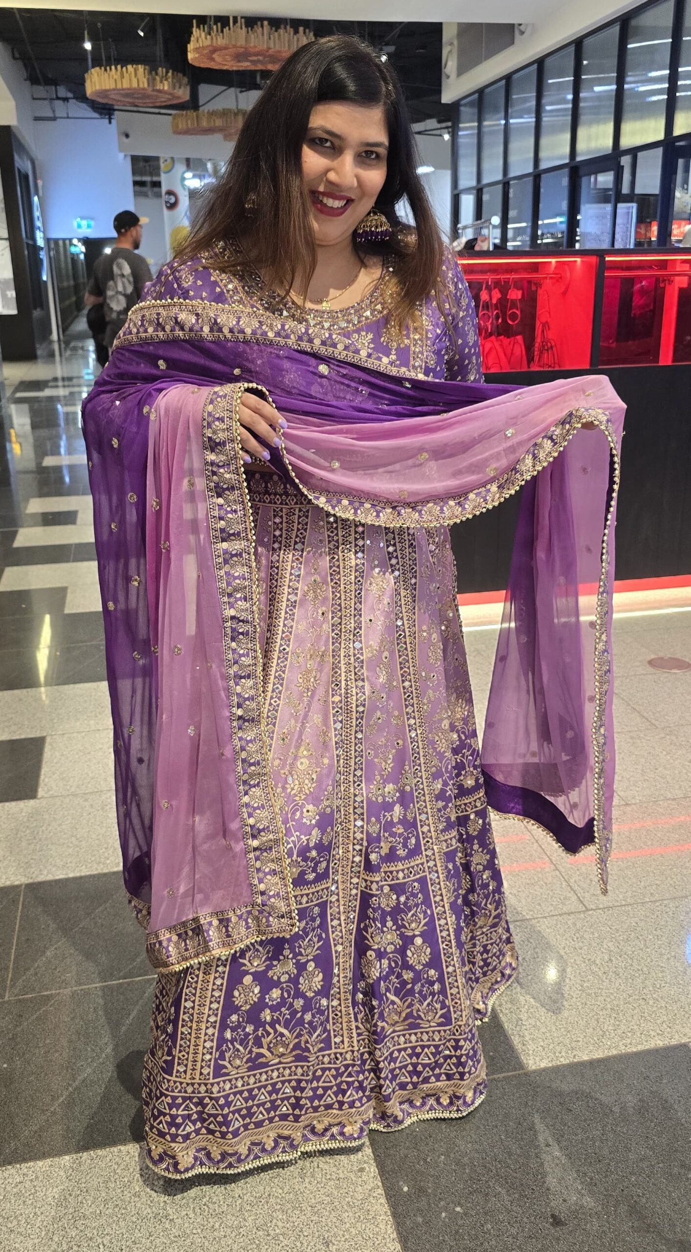 This elegant purple lehenga features heavy mirror work that highlights its traditional charm and refined craftsmanship. The fitted blouse is beautifully detailed, while the flared skirt flows gracefully with intricate patterns throughout. Paired with a matching dupatta, this lehenga is perfect for weddings, festive celebrations, and special occasions, offering a timeless blend of tradition and elegance.